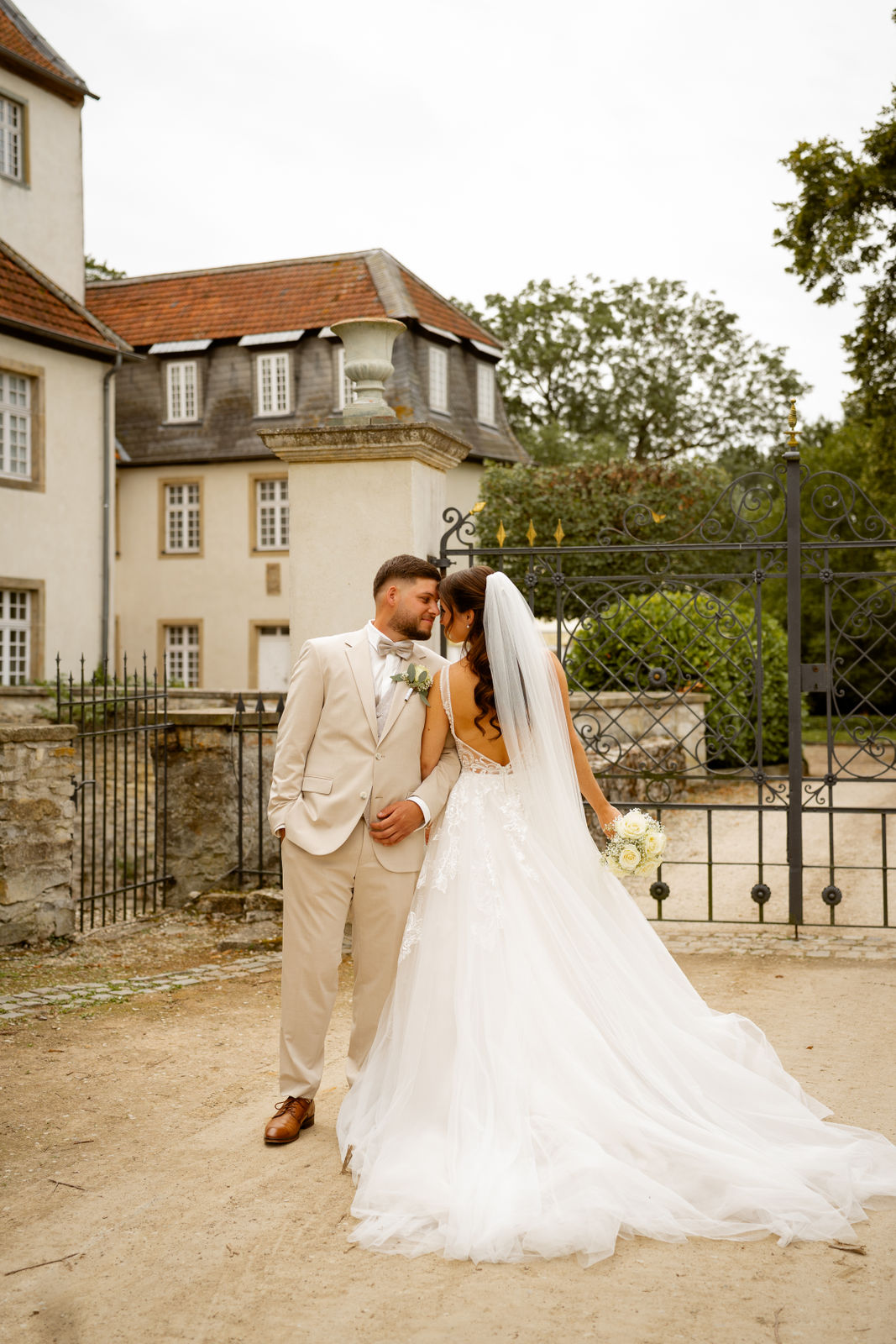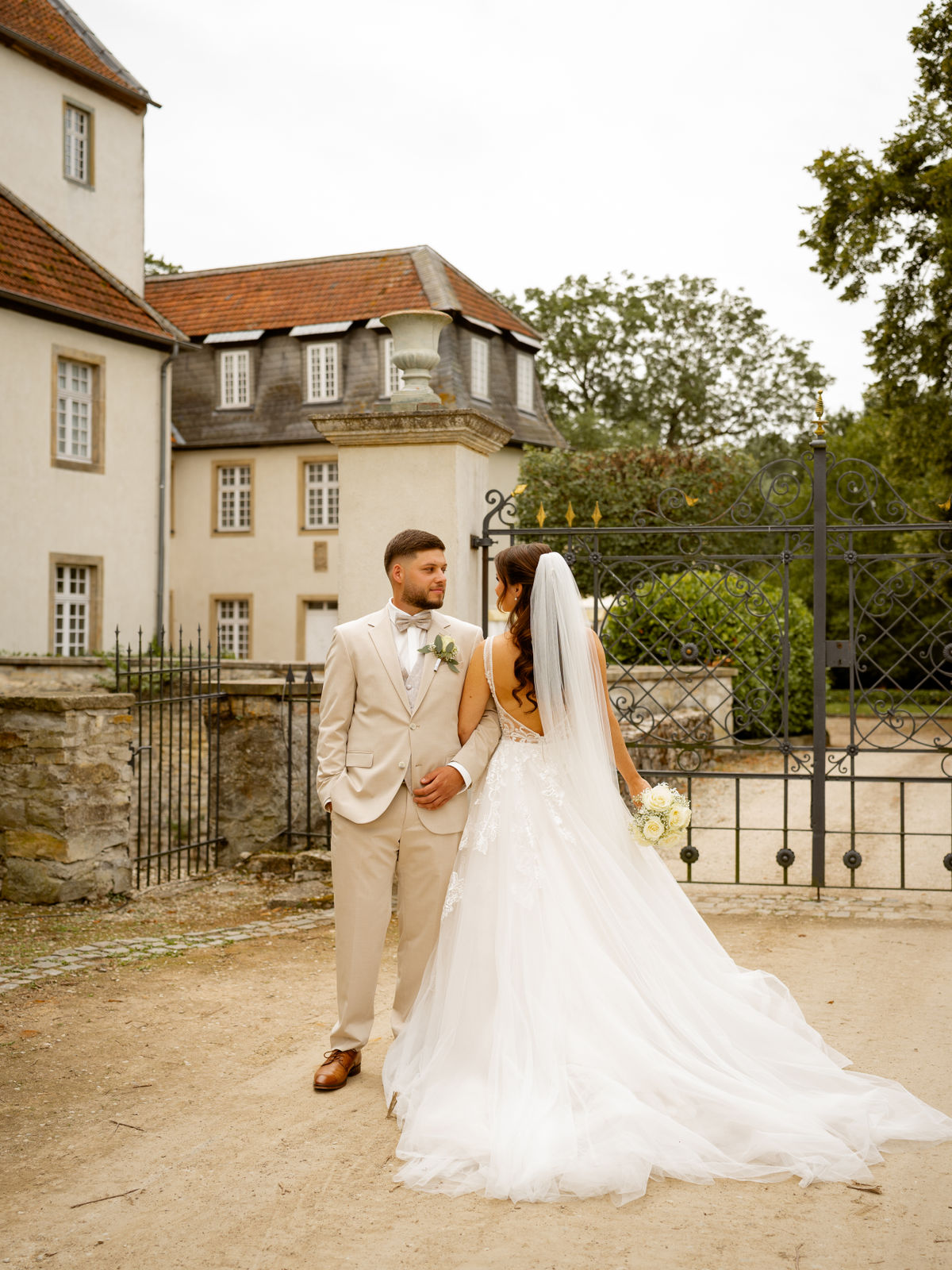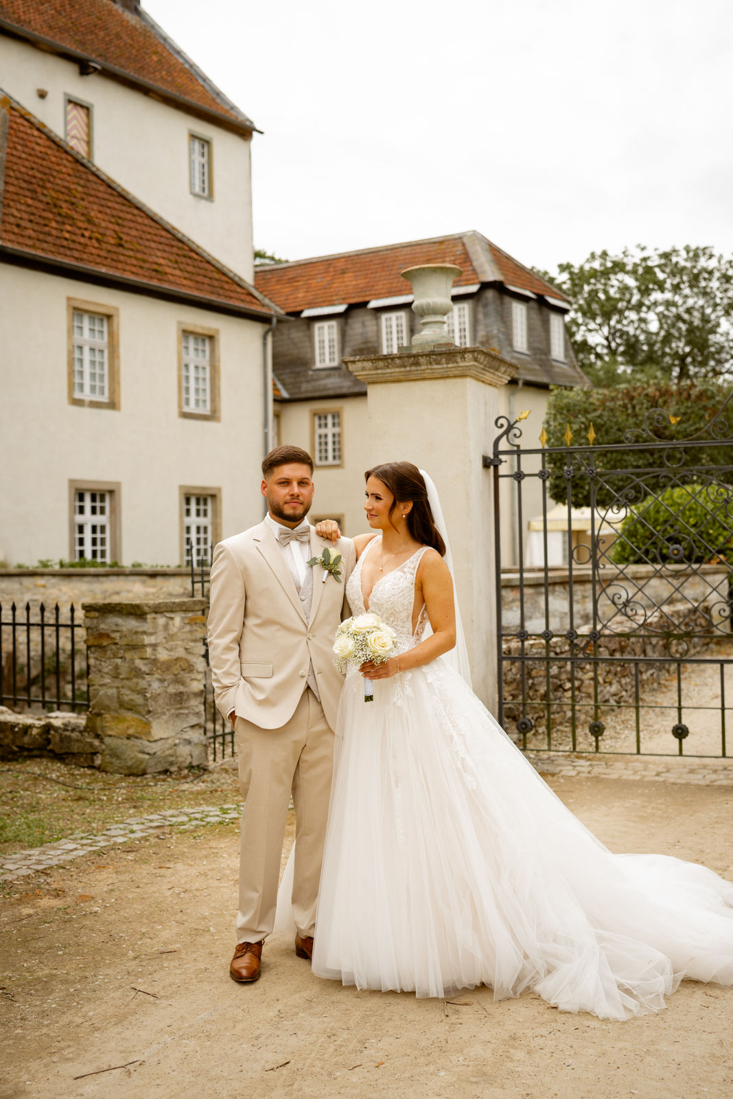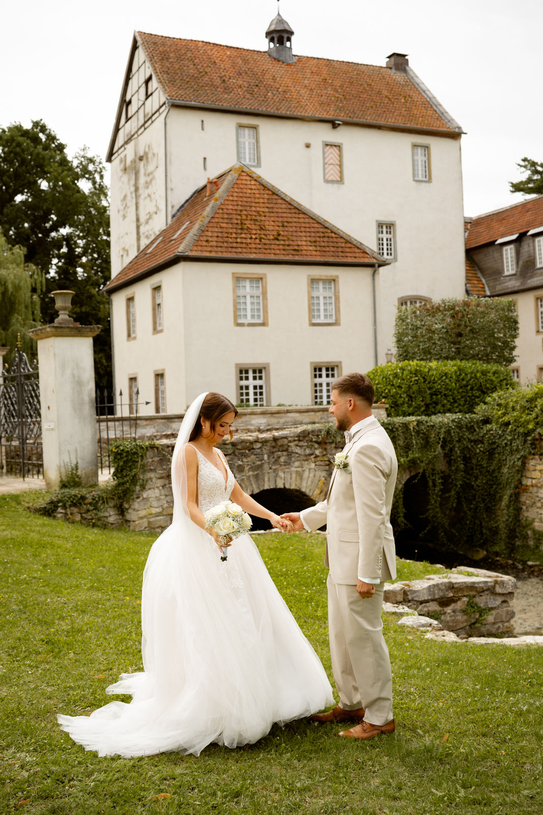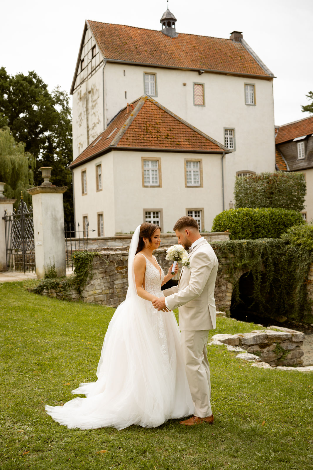 Für das Paarshooting haben wir uns die Dreckburg in Salzkotten ausgesucht. Beindruckende Fassaden, das Schmuckstück von Salzkotten. Ich lasse das Brautpaar dabei ganz natürlich agieren – ohne starre Posen, ohne Druck. Meine Kamera als stiller Beobachter.