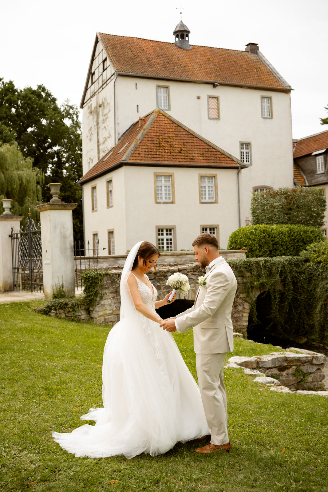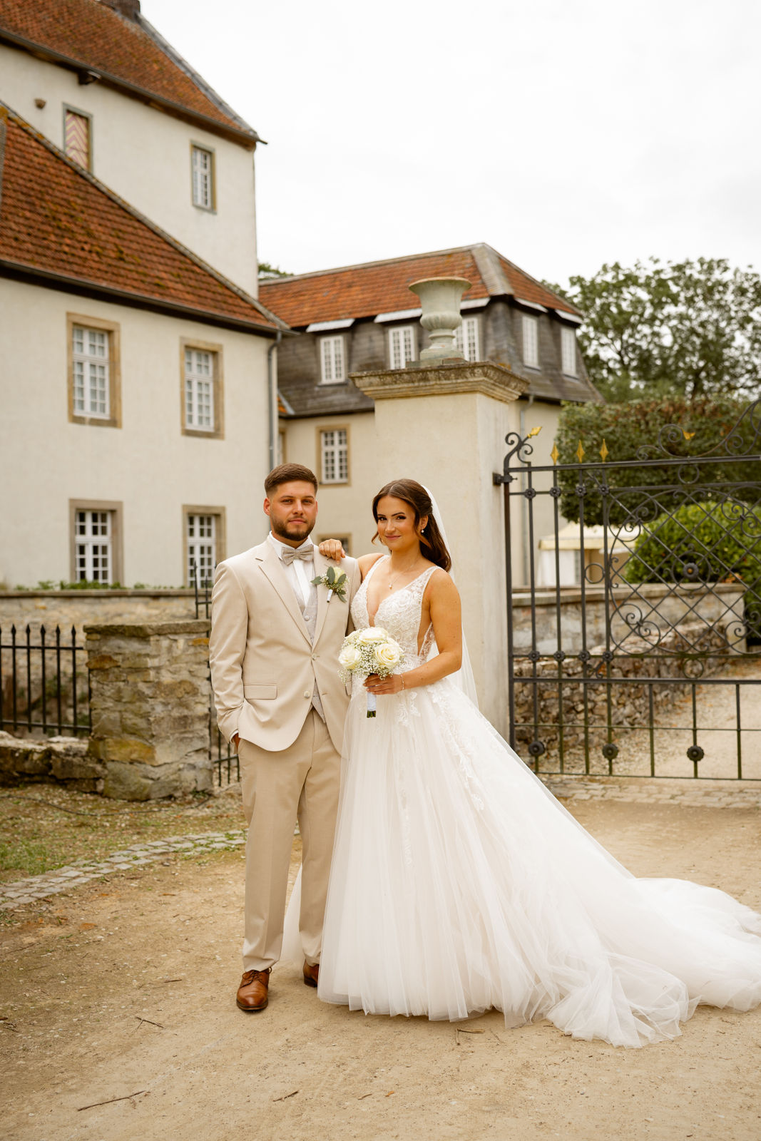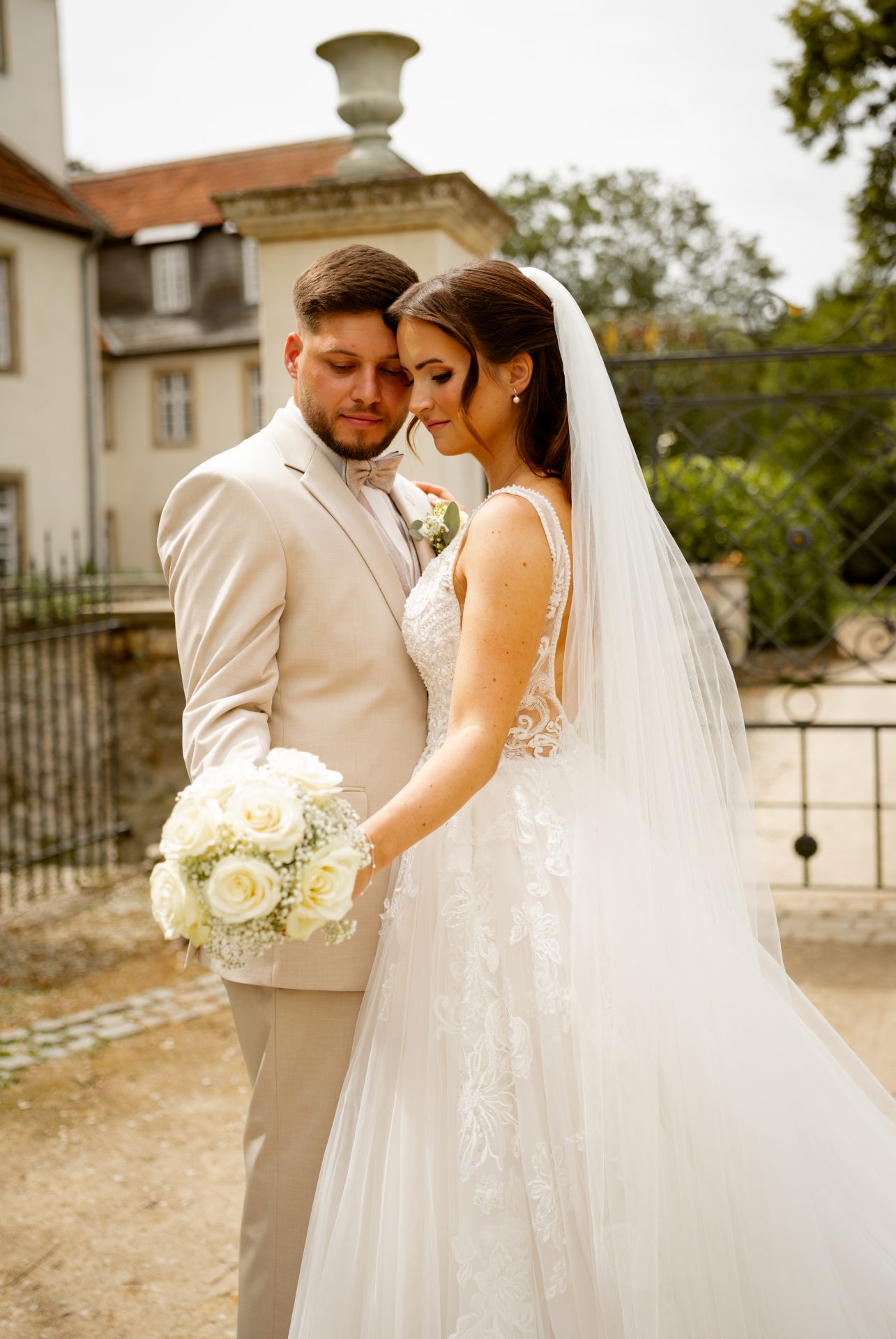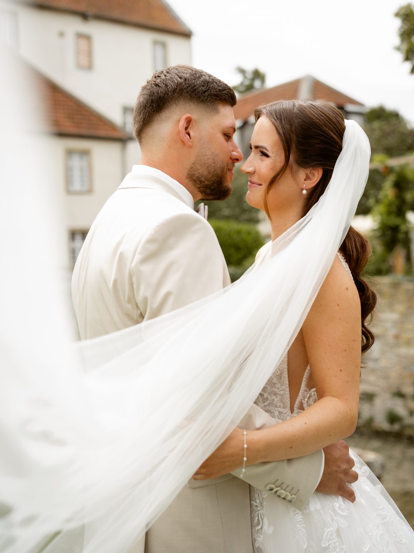 Für das Paarshooting haben wir uns die Dreckburg in Salzkotten ausgesucht. Beindruckende Fassaden, das Schmuckstück von Salzkotten. Ich lasse das Brautpaar dabei ganz natürlich agieren – ohne starre Posen, ohne Druck. Meine Kamera als stiller Beobachter.