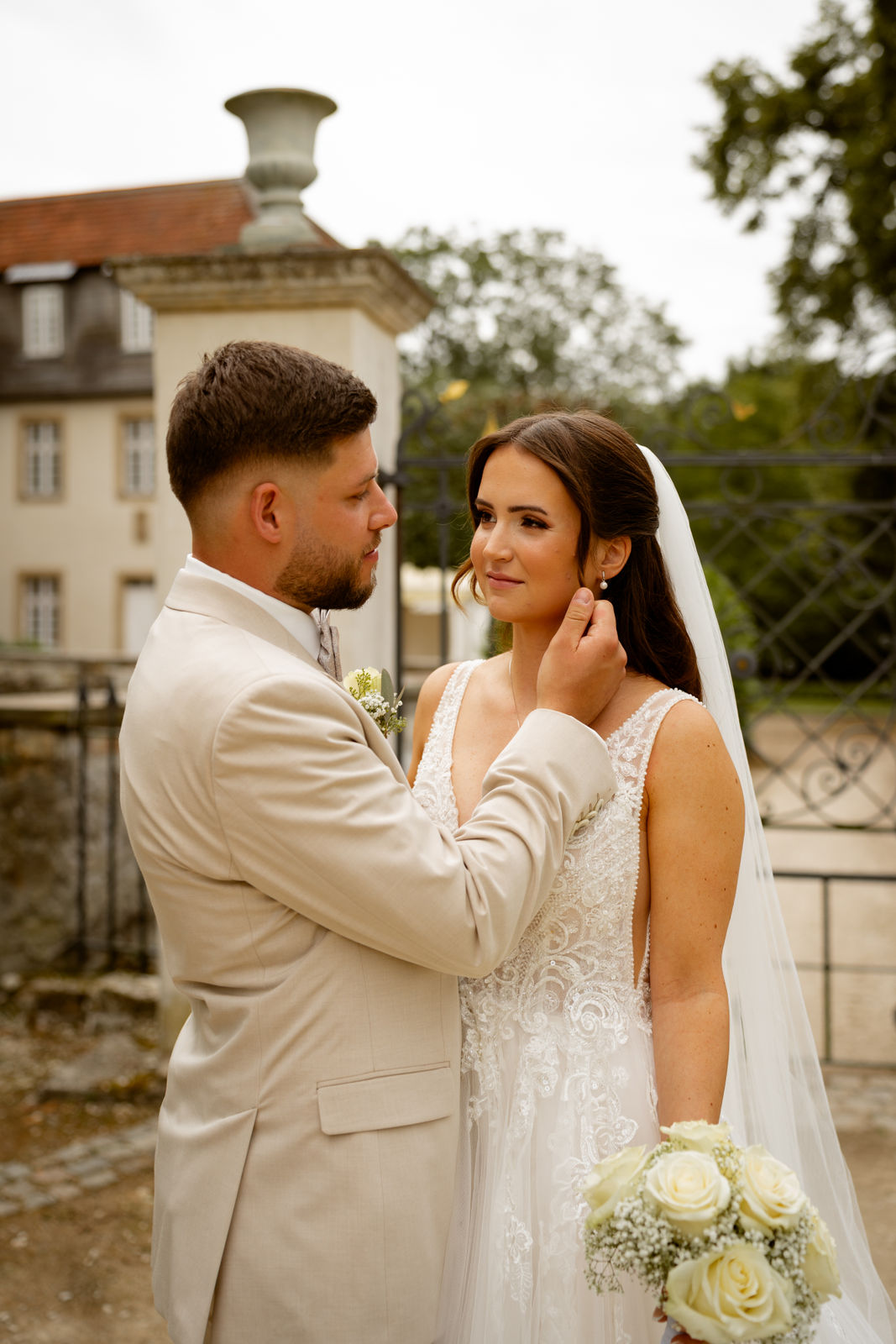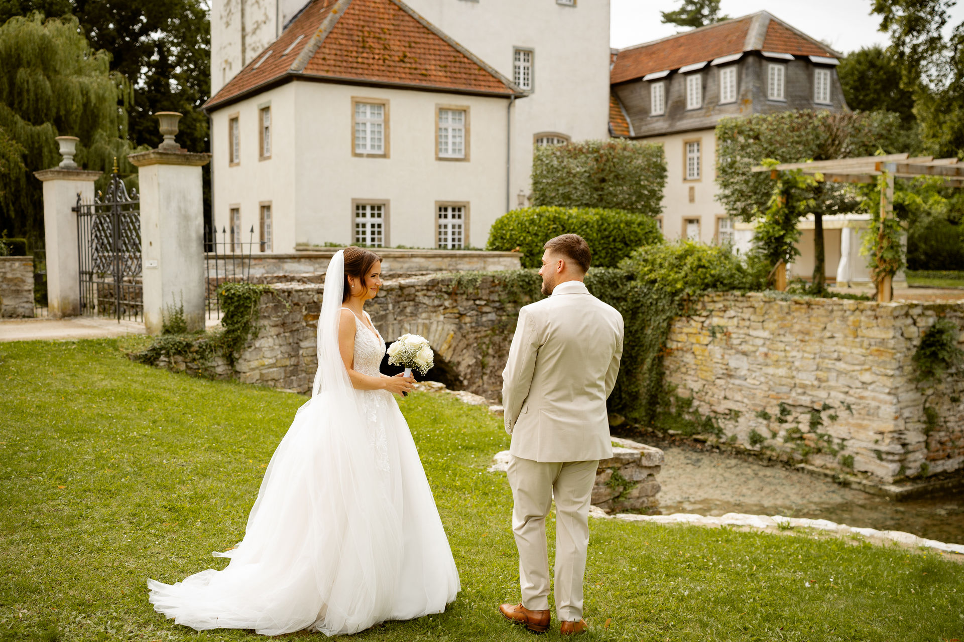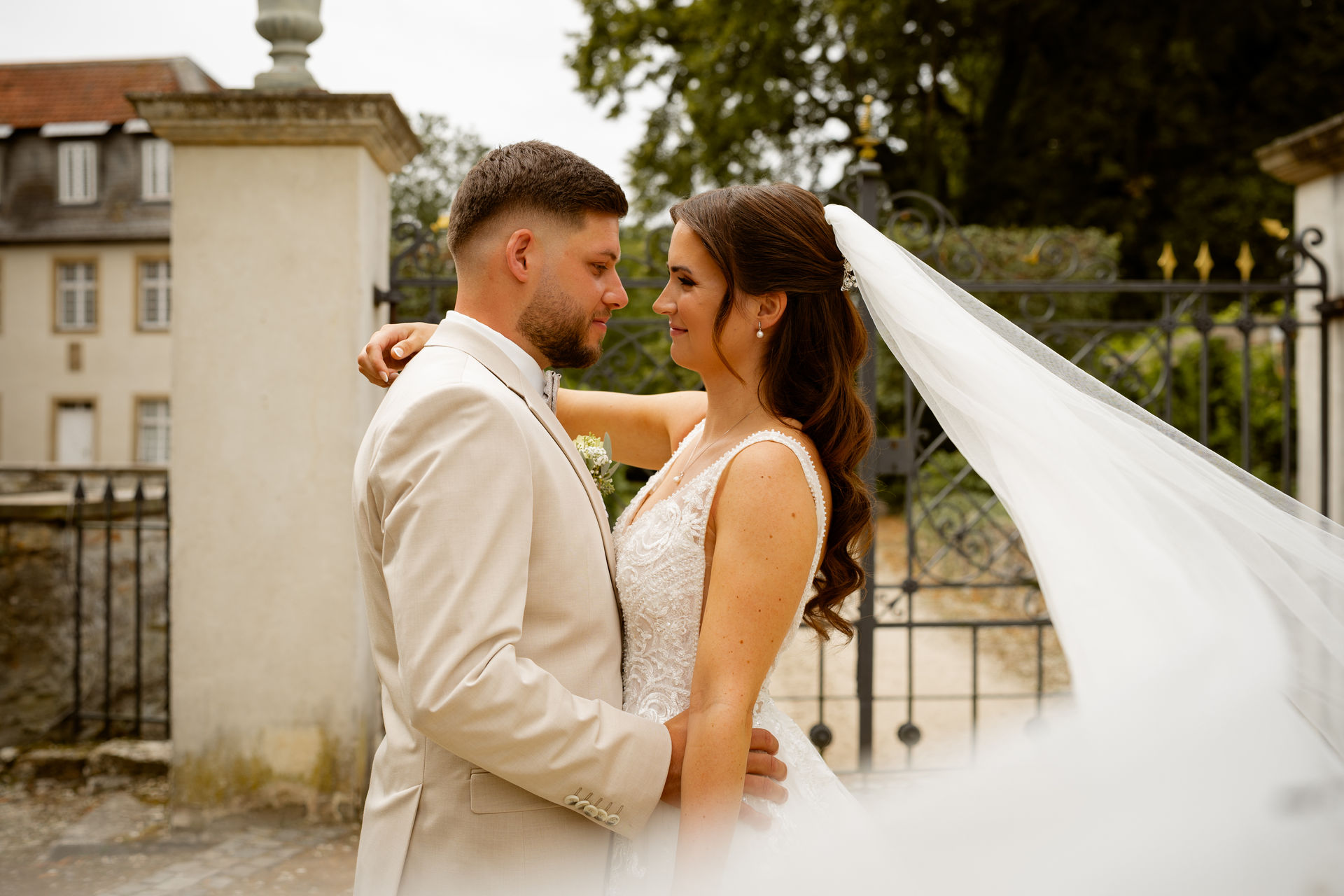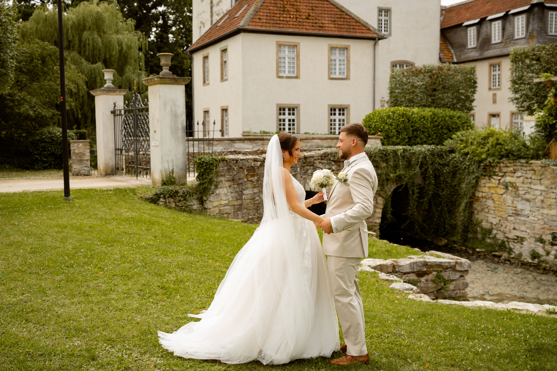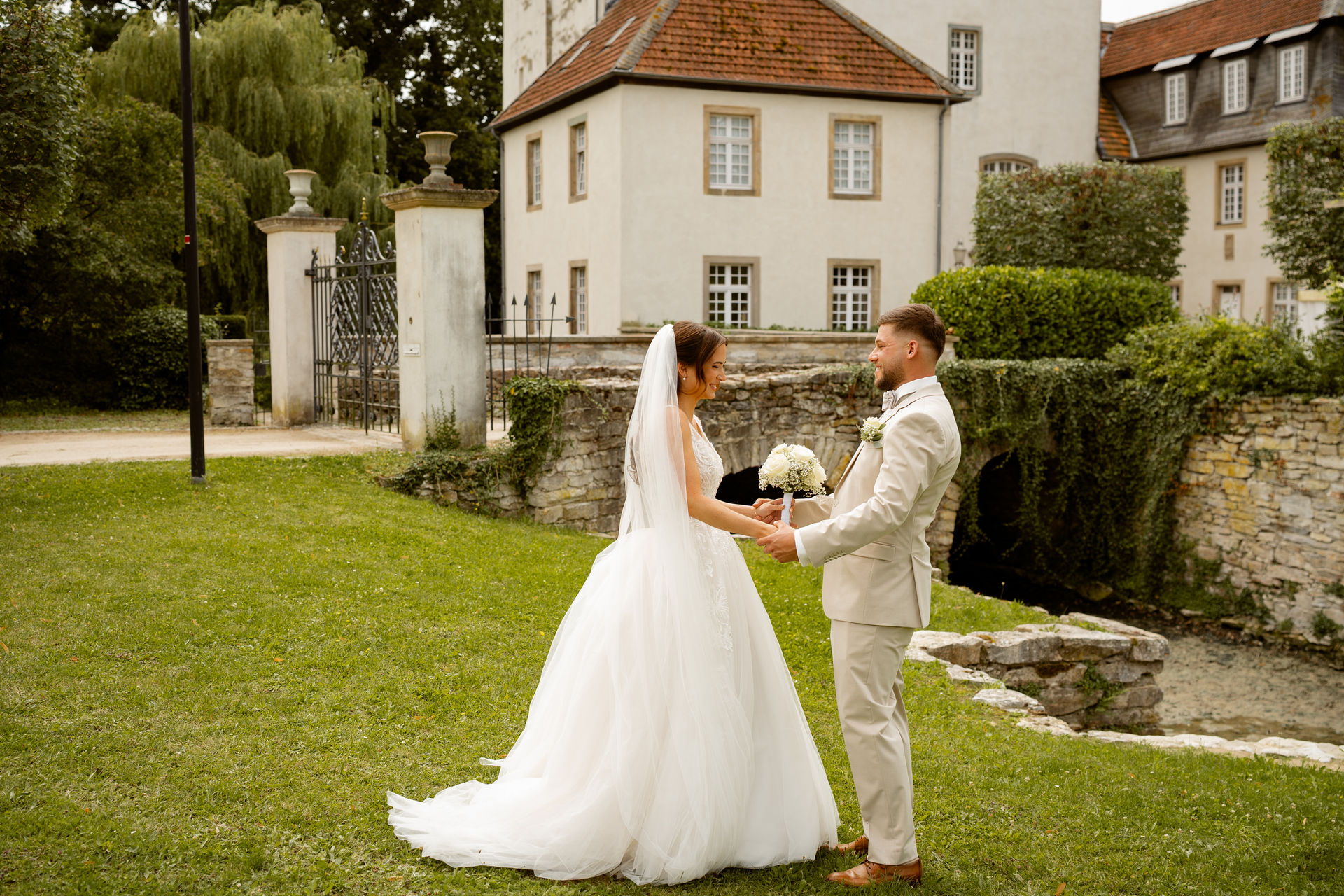 Für das Paarshooting haben wir uns die Dreckburg in Salzkotten ausgesucht. Beindruckende Fassaden, das Schmuckstück von Salzkotten. Ich lasse das Brautpaar dabei ganz natürlich agieren – ohne starre Posen, ohne Druck. Meine Kamera als stiller Beobachter.